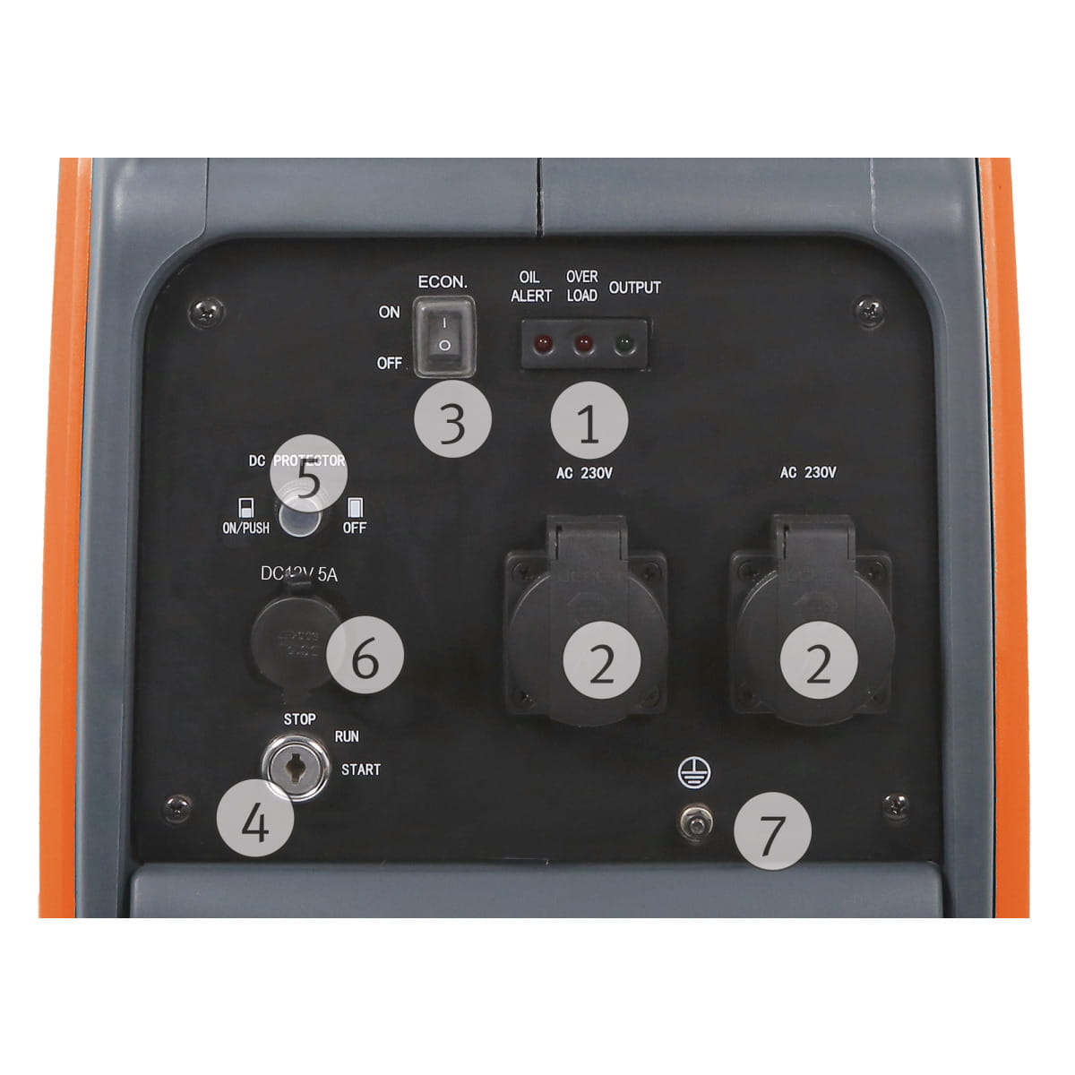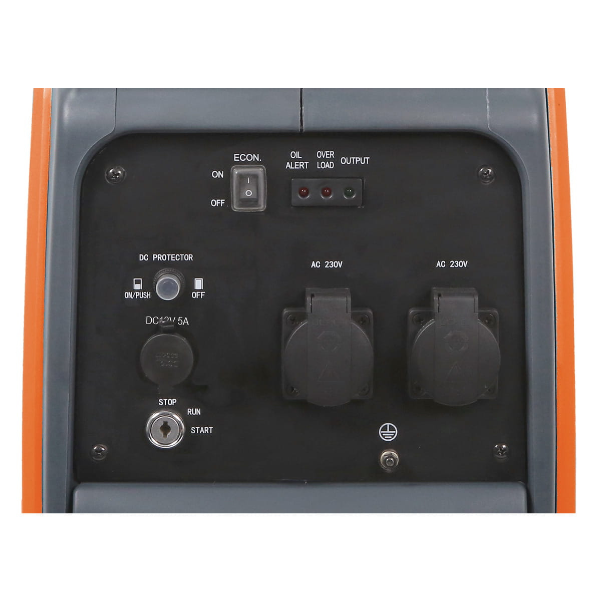 Lampki kontrolne napięcia wyjściowego, przeciążenia oraz braku oleju.