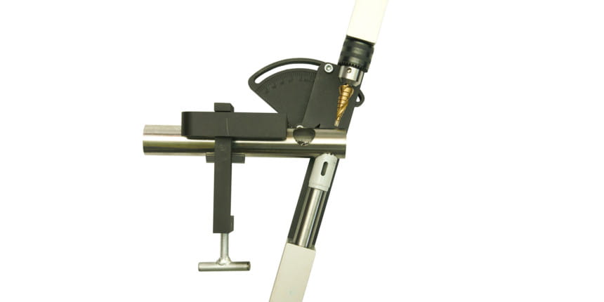 Przystawka umożliwia również wiercenie pod dowolnym kątem w zakresie od 0 do 50 stopni. Nastawy można precyzyjnie regulować. Aby uzyskać zadowalający efekt polecamy stosowanie wierteł krętych dobrej jakości. Jako napęd posłużyć może wiertarka z płynną regulacją prędkości. Płynna regulacja wymagana jest zwłaszcza podczas wiercenia w rurach ze stali nierdzewnej (np. dla średnicy 40mm przy rurach ze stali nierdzewnej zalecane obroty nie powinny być większe niż 110 obr/min).