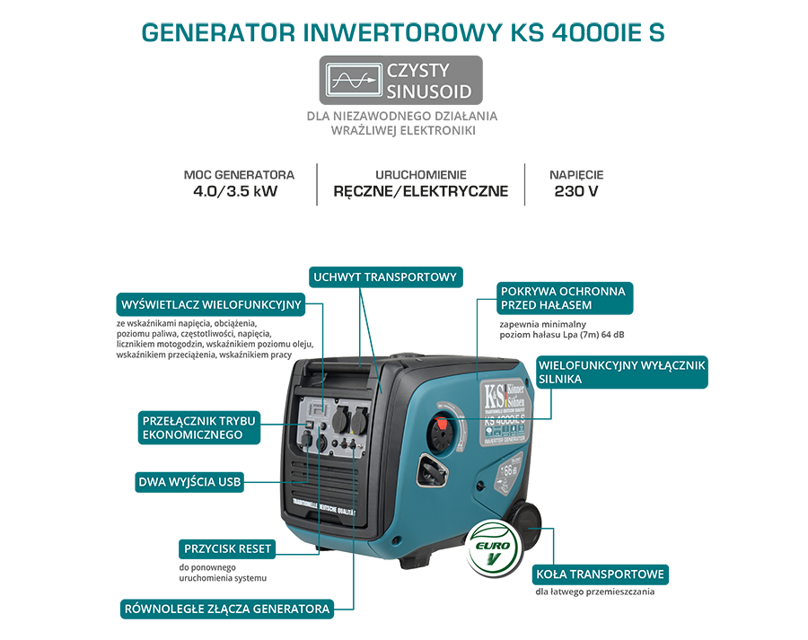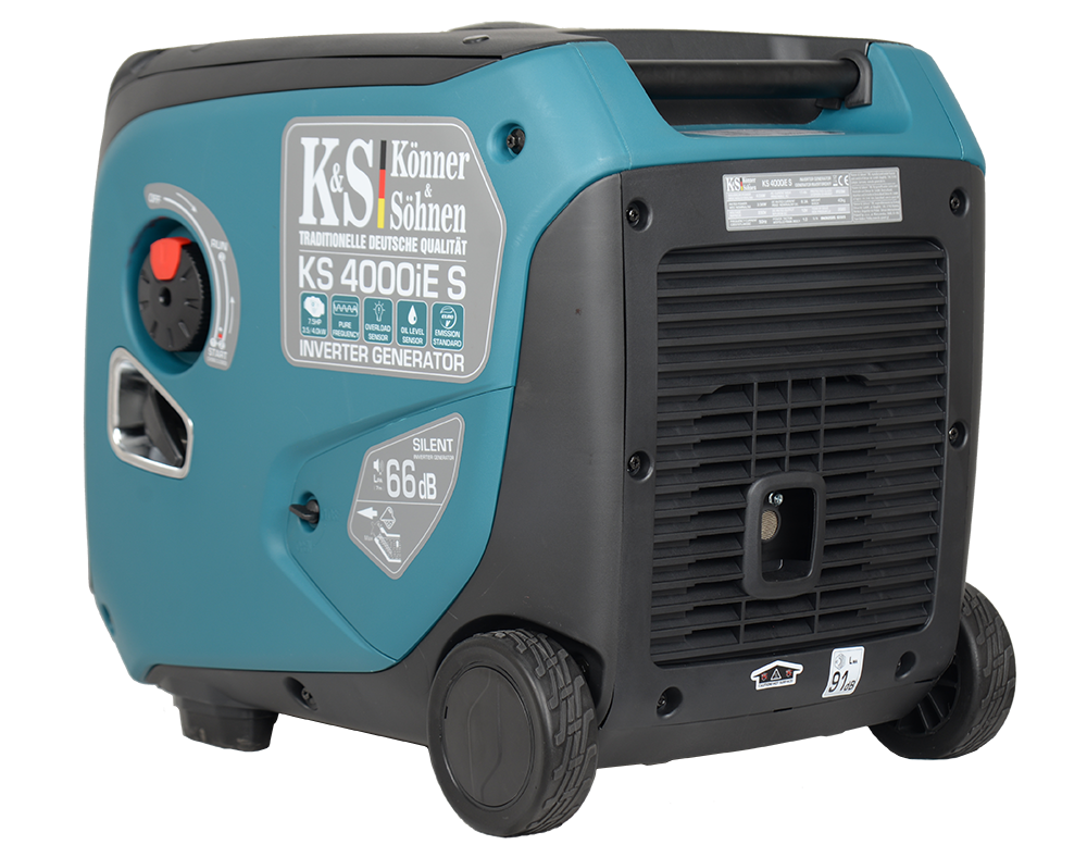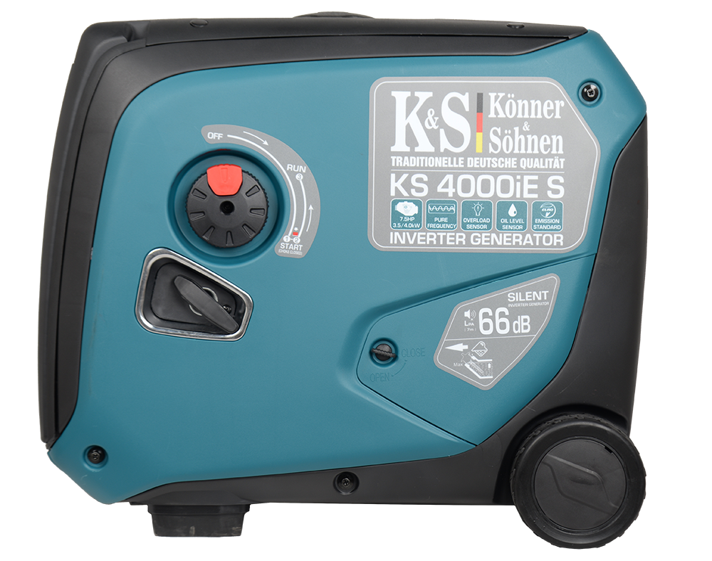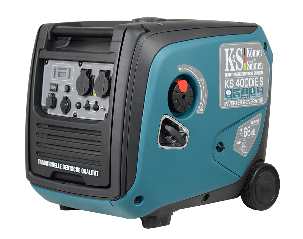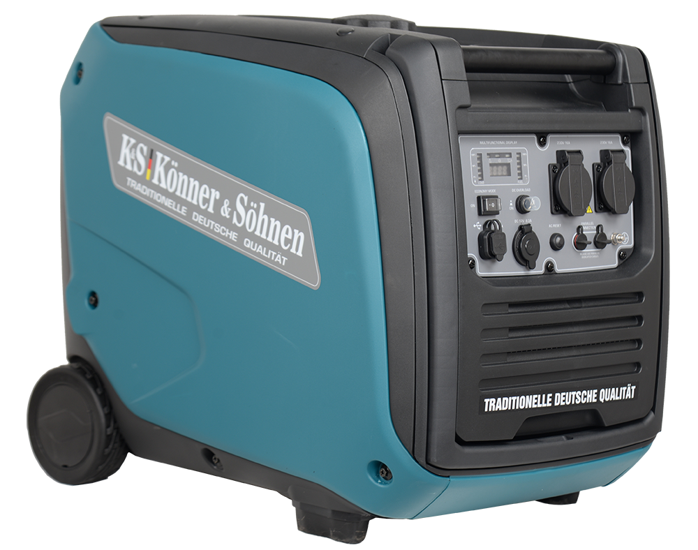 Przenośny generator KS 4000iE S niemieckiej TM Könner & Söhnen to wygodne źródło energii elektrycznej w obudowie chroniącej przed hałasem. Wbudowany moduł elektroniczny sterowany mikroprocesorem steruje pracą generatora i zapewnia stałą częstotliwość 50 Hz i napięcie 230 V.