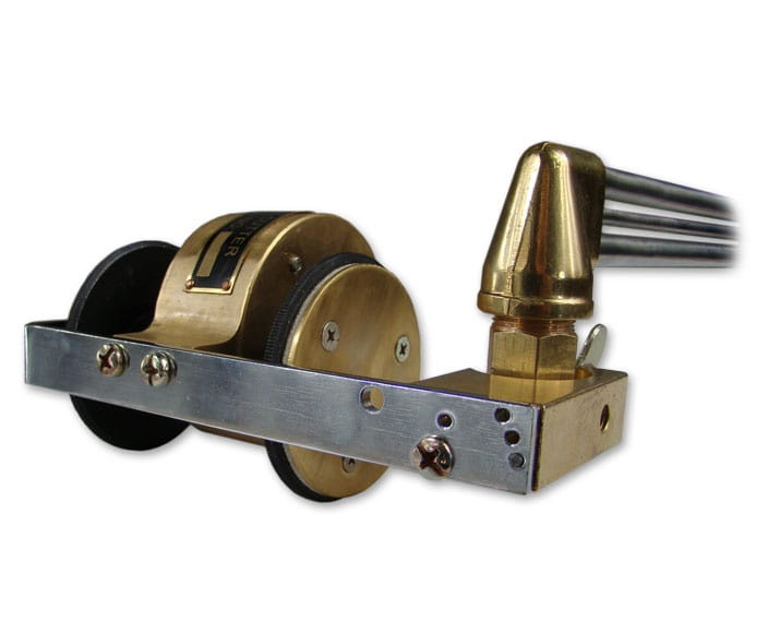 Prowadnik palnika TWC-1 Sherman-profi umożliwia jego precyzyjne prowadzenie po ciętym materiale wzdłuż dowolniej krzywej oraz zapewnia utrzymanie stałej prędkości cięcia. Urządzenie zbudowane jest na bazie masywnej zębatej przekładni mechanicznej o zakresie prędkości obrotowej ograniczonym do wartości stosowanych przy cięciu termicznym. Duże, przyczepne, ząbkowane koła prowadzące oraz spora waga 1,3 kg pozwalają na utrzymanie dużej dokładności pozycjonowania palnika i cięcia. Gniazdo palnika umożliwia regulację odległości dyszy od powierzchni materiału. Boczny otwór umożliwia zamontowanie cyrkla do wycinania kół. Otwory regulacyjne pozwalają na dowolną zmianę kąta cięcia. Urządzenie zbudowane głównie z masywnych elementów mosiężnych nie ma zasilania elektrycznego, regulacja prędkości polega wyłącznie na wymuszonym, ręcznym posuwie mechanicznym. Doskonały sprzęt do precyzyjnego cięcia za pomocą zwykłego palnika ręcznego. Po adaptacji może być używany z dowolnie wybranym typem palnika.