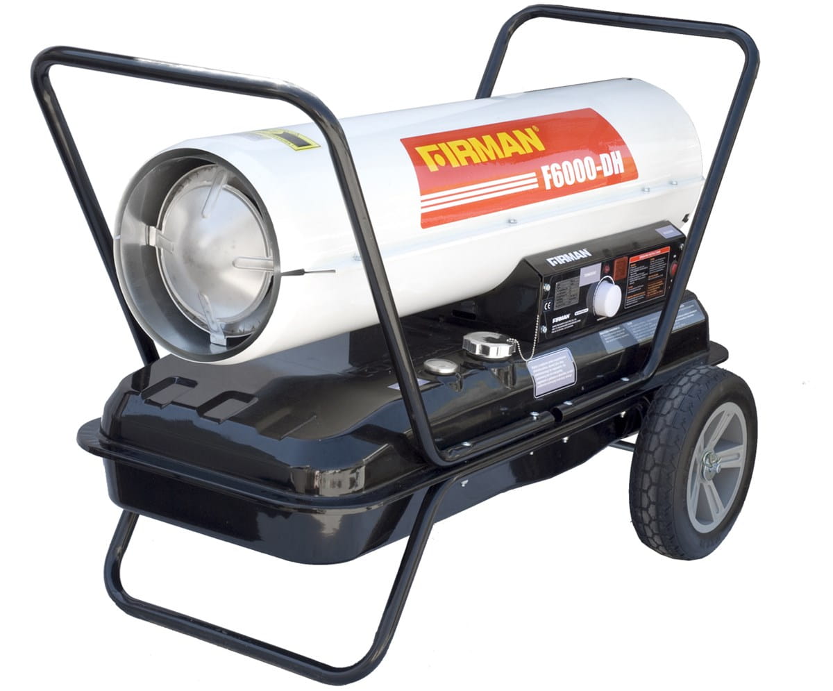 Przewoźna nagrzewnica olejowa Firman F6000-DH o mocy 55,8 kW bez odprowadzenia spalin tzw. otwarta komora spalania o bardzo dobrym wyposażeniu: posiada diodowy załącznik pracy, dioda pracy, regulowany skokowo termostat, wyświetlacz temp., wskaźnik paliwa, dwa uchwyty transportowe.