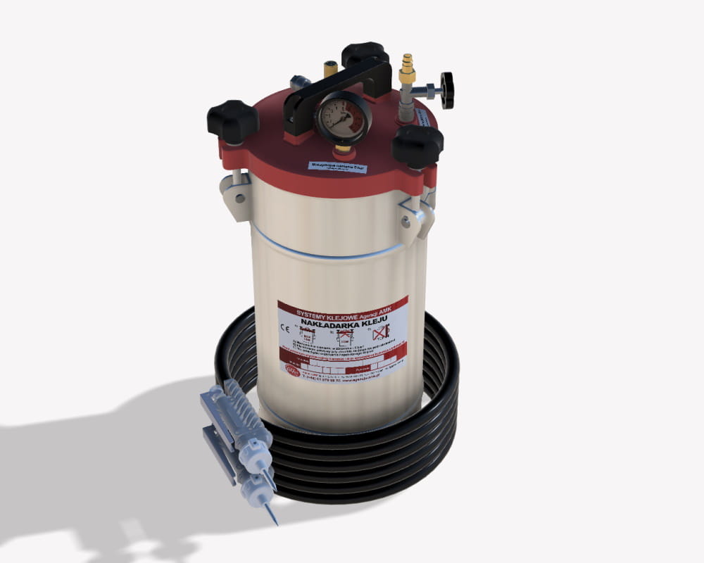 Klej wlewamy do zbiornika. Zamykamy pokrywę doprowadzamy sprężony gaz techniczny azot suchy (2-5 bar). Zakładamy właściwie dobraną dysze klejową. Na pistolecie regulujemy ilość podawanego kleju – urządzenie jest gotowe do pracy.