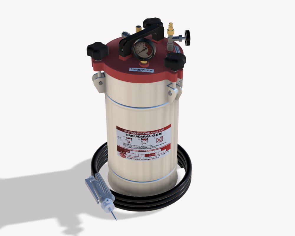 Klej wlewamy do zbiornika. Zamykamy pokrywę doprowadzamy sprężony gaz techniczny azot suchy (2-5 bar). Zakładamy właściwie dobraną dysze klejową. Na pistolecie regulujemy ilość podawanego kleju – urządzenie jest gotowe do pracy.