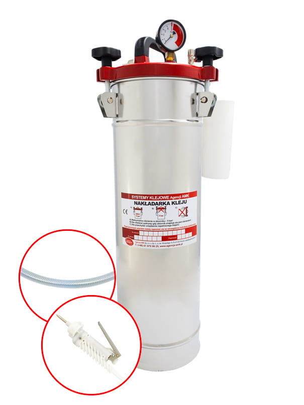 Praca z nakładarką jest bardzo prosta. Klej wlewamy do zbiornika (lub pośredniego wiaderka), zamykamy pokrywę, doprowadzamy sprężone powietrze (2-5 bar) – jedno napompowanie wystarczy do opróżnienia całego zbiornika. Dzięki temu nakładarka jest bardzo uniwersalna i mobilna (nie musi być podłączona do kompresora). Zakładamy właściwie dobraną dyszę klejową. Na pistolecie regulujemy ilość podawanego kleju – urządzenie jest gotowe do pracy.