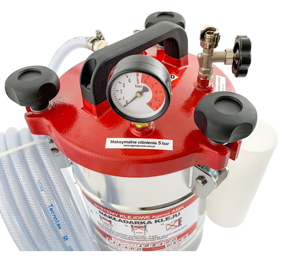 Praca z nakładarką jest bardzo prosta. Klej wlewamy do zbiornika (lub pośredniego wiaderka), zamykamy pokrywę, doprowadzamy sprężone powietrze (2-5 bar) – jedno napompowanie wystarczy do opróżnienia całego zbiornika. Dzięki temu nakładarka jest bardzo uniwersalna i mobilna (nie musi być podłączona do kompresora). Zakładamy właściwie dobraną dyszę klejową. Na pistolecie regulujemy ilość podawanego kleju – urządzenie jest gotowe do pracy.