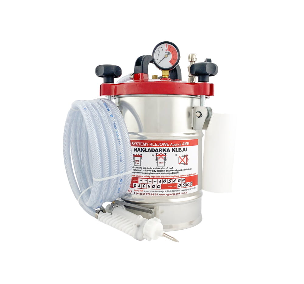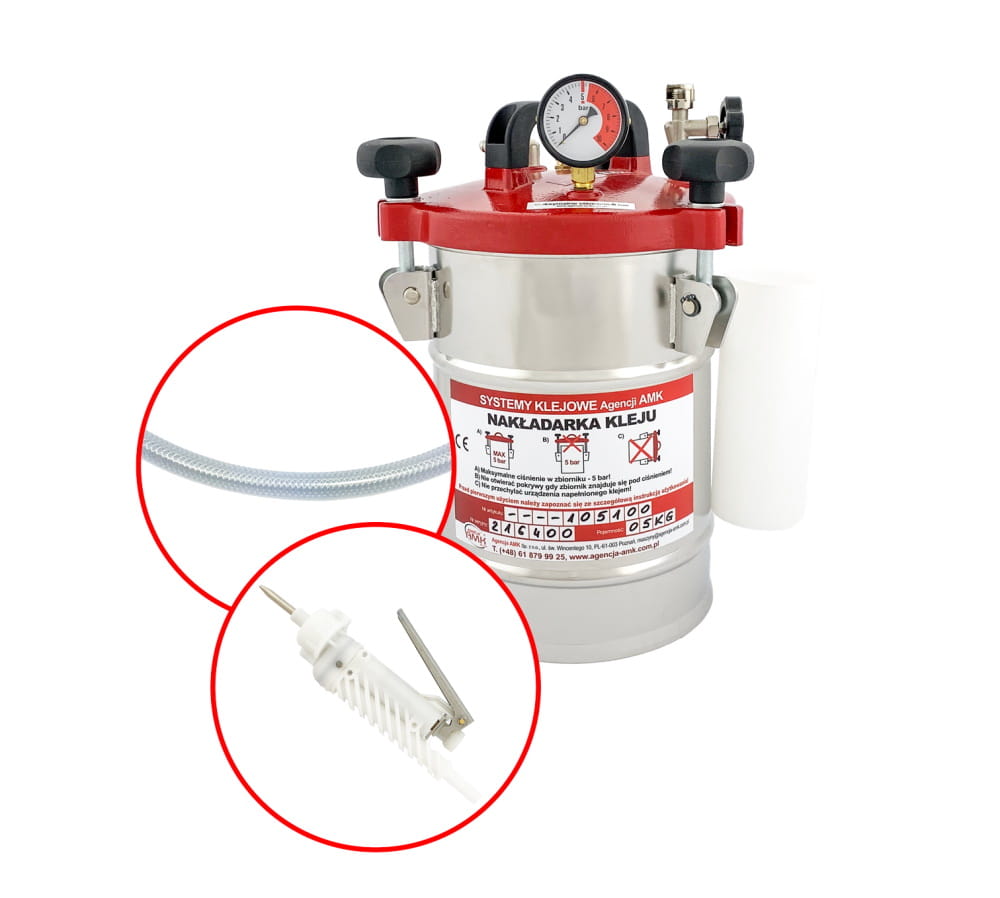 Praca z nakładarką jest bardzo prosta. Po napełnieniu zbiornika i zamknięciu pokrywy doprowadzane jest sprężone powietrze (2-5 bar) – jedno napompowanie wystarczy do opróżnienia całego zbiornika, nie musi być podłączona na stałe do kompresora. Po założeniu odpowiedniej dyszy klejowej i regulacji ilości podawanego kleju urządzenie jest w pełni gotowe do pracy!