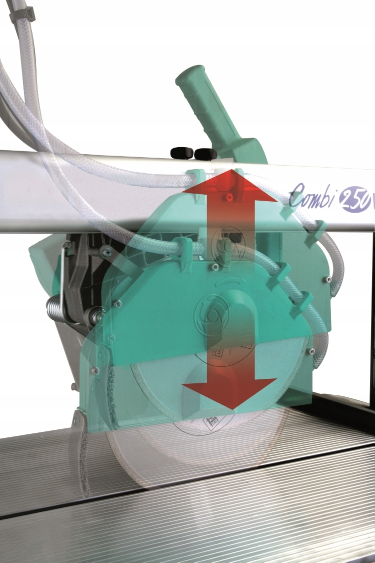 Przecinarka stołowa Combi 250 VA to lekka przecinarka o dużej wydajności przy wyjątkowo prostej obsłudze. Nadająca się do cięcia wszelakich materiałów twardych diamentowa tarcza, prowadzona jest idealnie prosto na ośmiu techno-polimerowych rolkach. Aluminiowa suwnica umożliwia cięcia od prostopadłego ∝ 90° do ukośnego 45° przy płynnej regulacji stopnia nachylenia. Przecinarka wyposażona w system eliminacją pękającej powierzchni.