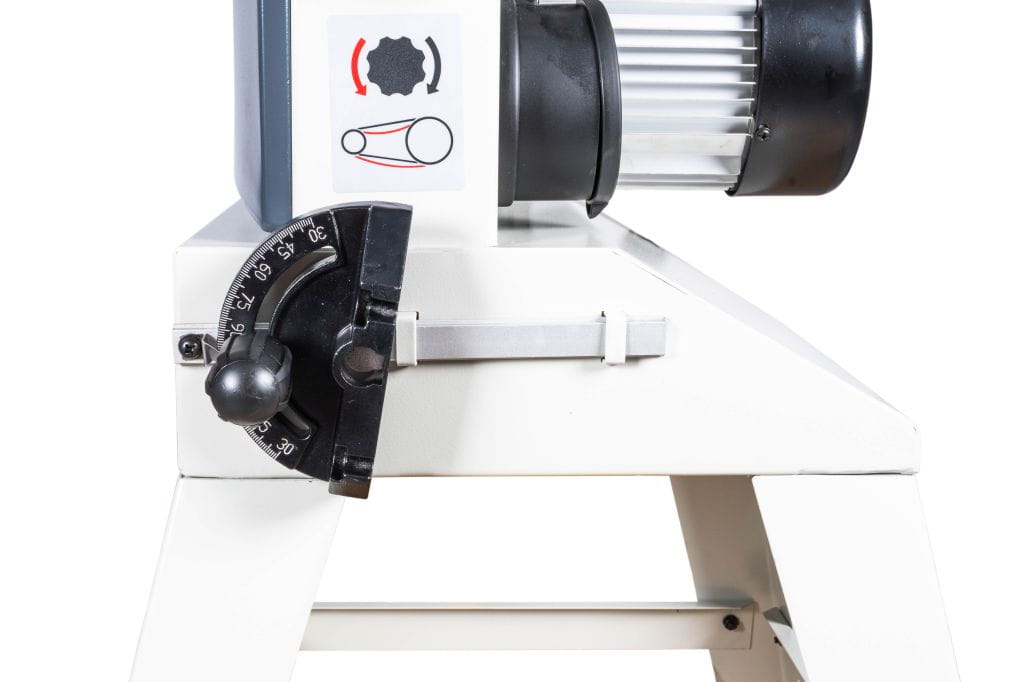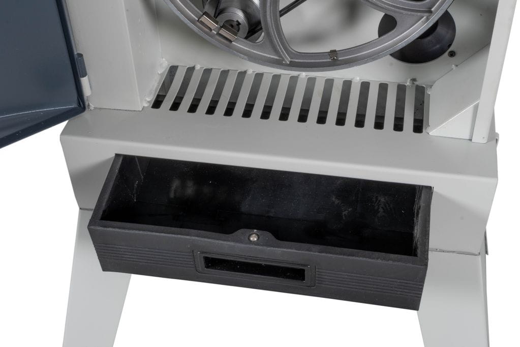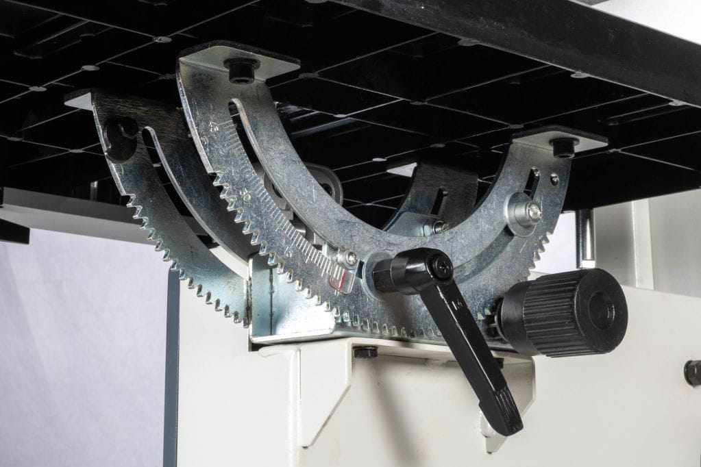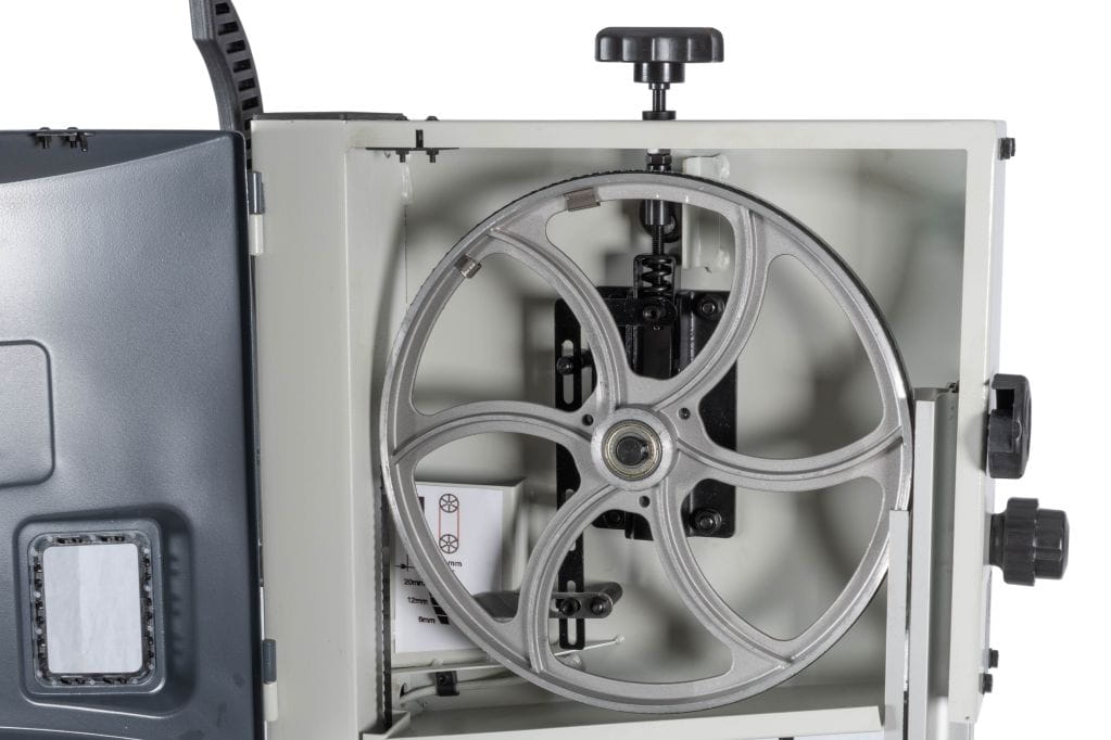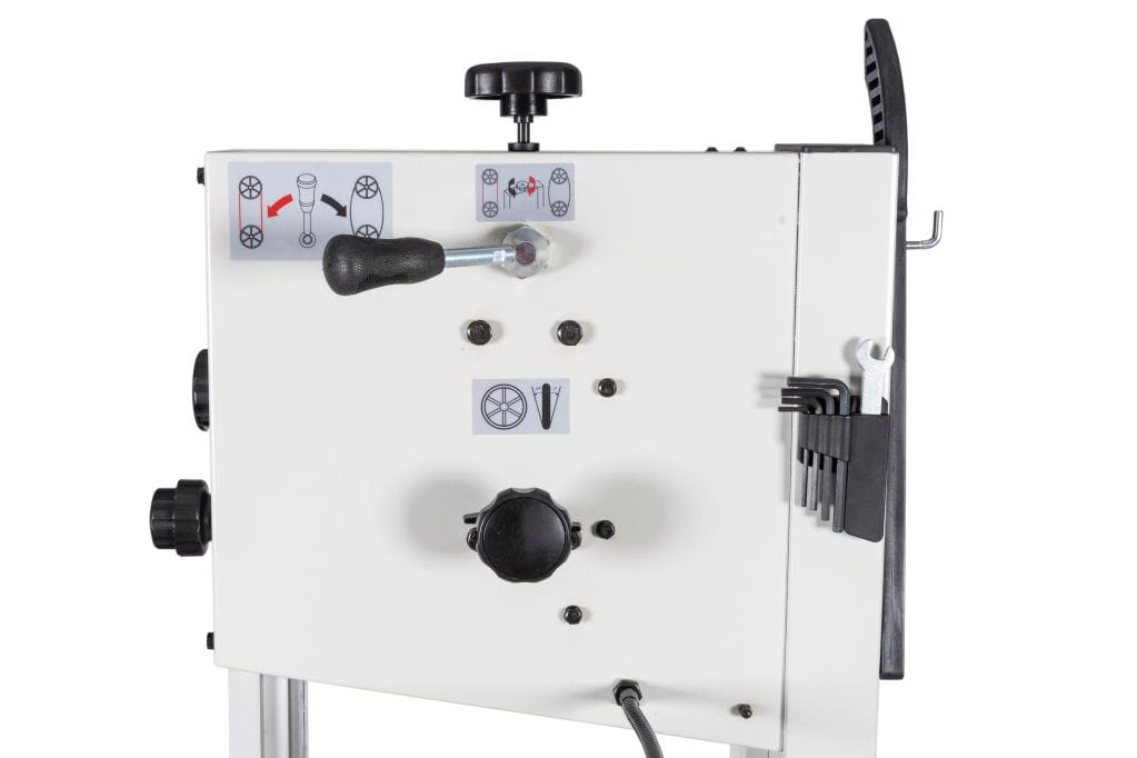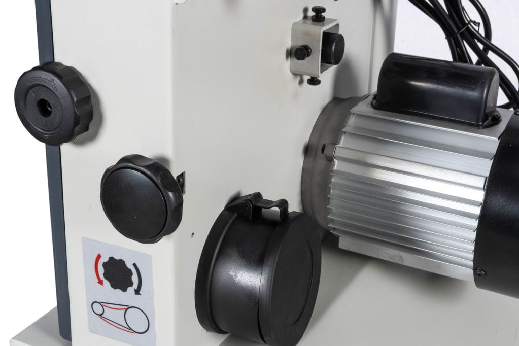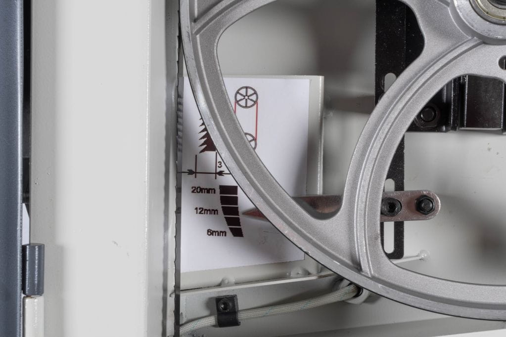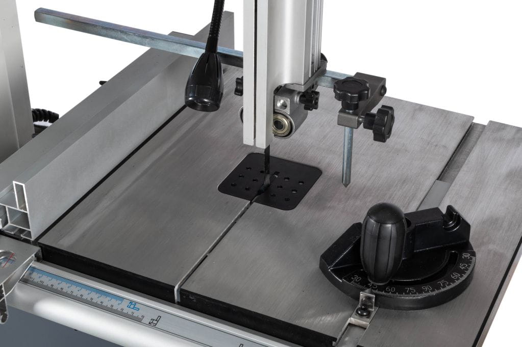- dodatkowym wyposażeniem tego modelu przecinarki jest wizjer służący do kontroli stanu naciągu taśmy tnącej, oświetlenie powierzchni roboczej oraz przymiar do wycinania okręgów