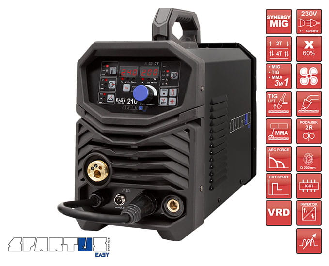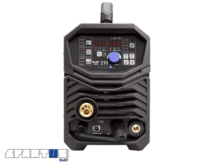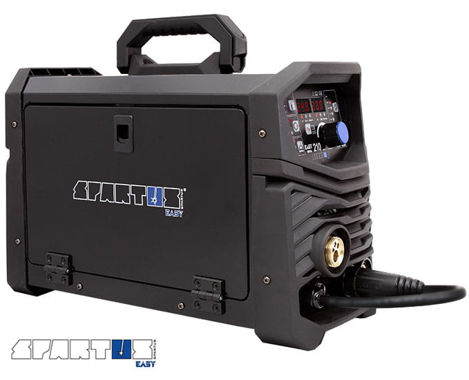 SPARTUS® EasyMIG 210 to nowoczesny, inwertorowy półautomat spawalniczy, skonstruowany w oparciu o tranzystory IGBT. Posiada funkcję spawania w osłonie gazów obojętnych i aktywnych (MIG/MAG), spawanie elektrodą otuloną (MMA) oraz spawanie TIG Lift z zajarzeniem łuku przez potarcie. Łatwa zmiana biegunowości umożliwia spawanie drutem samoosłonowym bez gazu.