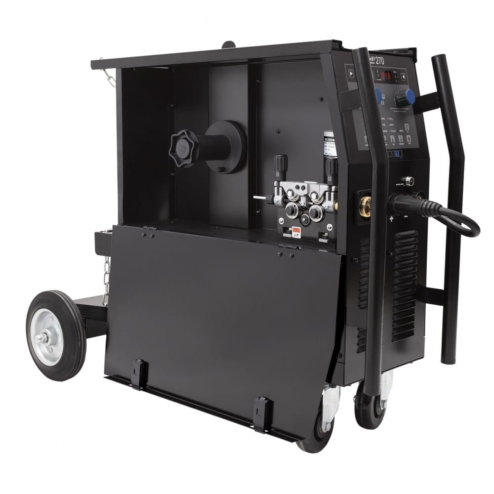 Maksymalny prąd spawania dla modelu SPARTUS® EasyMIG 270 wynosi 250A dla metod MIG/MAG, TIG oraz 230A dla metody MMA. Wysoki 60% cykl pracy, zapewnia stabilne parametry wyjściowe podczas długotrwałych prac spawalniczych. Urządzenie zasilane jest z sieci trójfazowej 400V.