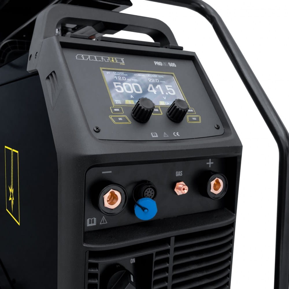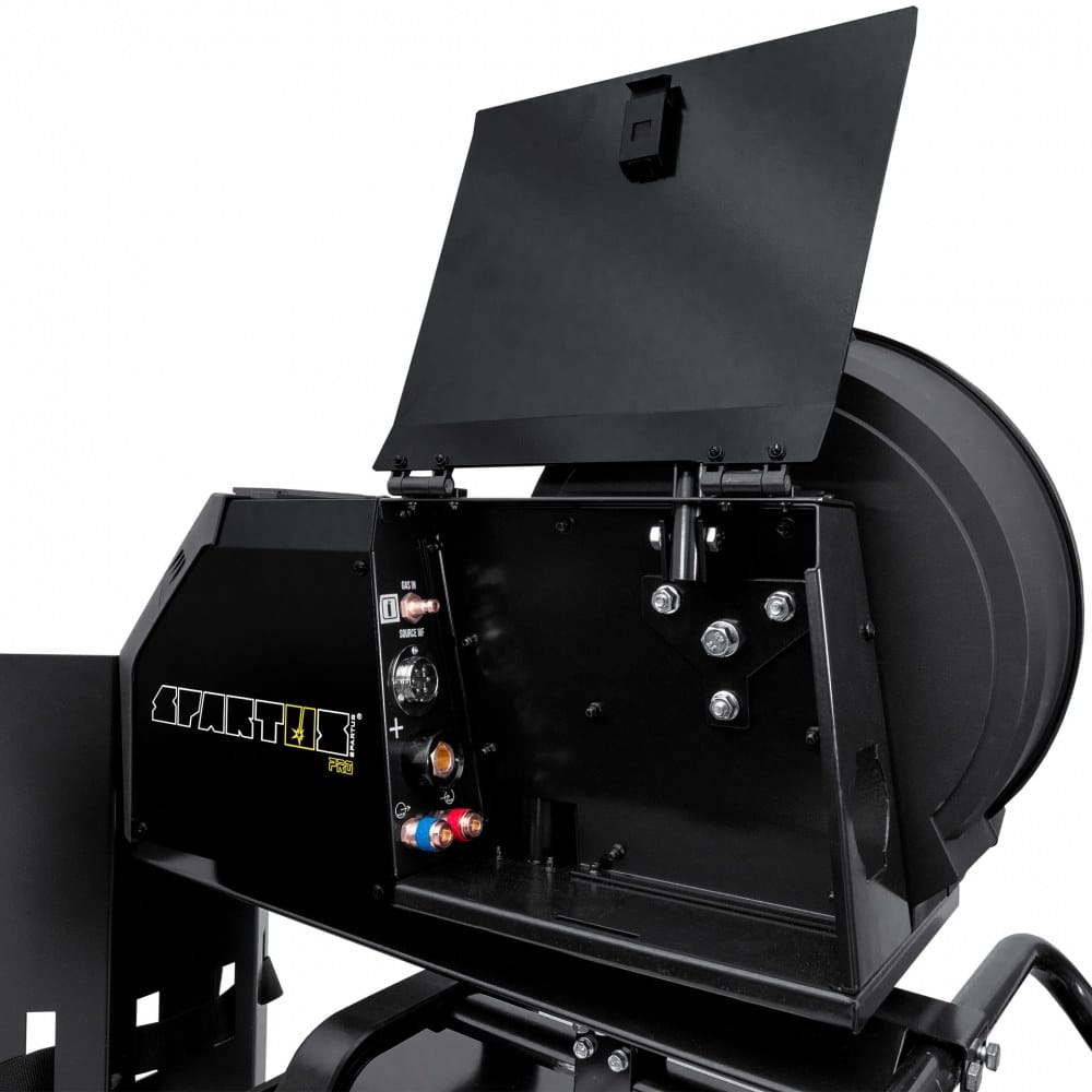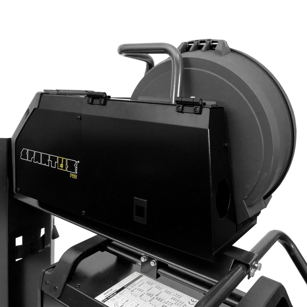 SPARTUS® Pro MIG420H. Profesjonalny, przemysłowy półautomat spawalniczy typu Tower z wydzielonym podajnikiem drutu. Wykonany w technologii inwertorowej z wykorzystaniem najwyższej jakości podzespołów. Umożliwia spawanie metodami MIG/MAG oraz MMA. Maksymalny prąd spawania dla obydwu metod wynosi 420A. Urządzenie zasilane jest z sieci trójfazowej 400V.
