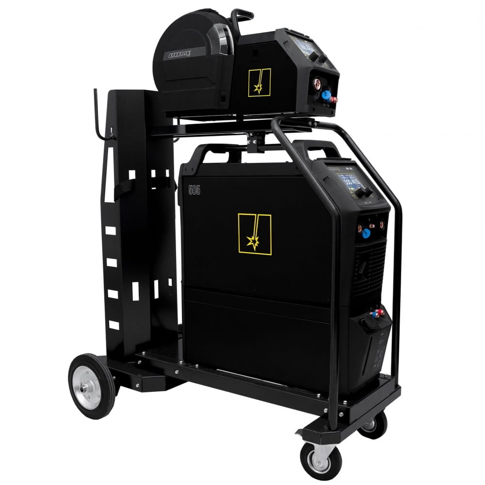 Stabilna konstrukcja urządzenia pozwala na montaż dużej butli z gazem osłonowym. Tak skomponowany zestaw można swobodnie przemieszczać dzięki wytrzymałym kołom z przednią osią skrętną.