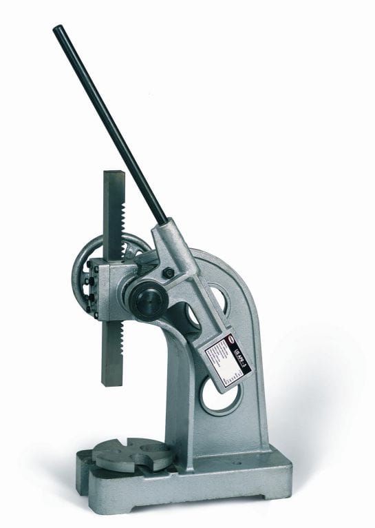 Zbudowana jest z żeliwnego korpusu, stołu i dwóch zębatych elementów, które poprzez dźwignię z grzechotką zapewniają siłę nacisku prasy