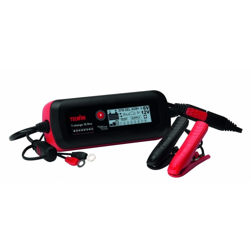 Jednofazowy Prostownik T-Charge 12 EVO od Telwin to przenośne, niewielkich rozmiarów narzędzie do ładowania 6 i 12 woltowych akumulatorów kwasowych i żelowych typu: