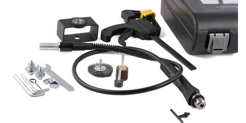 Przystawka jest wyposażona w uchwyt do szlifierki z systemem obrotowym (mocowanym do stołu lub imadła), który sprawi, że szlifierka podąży za operatorem podczas pracy.