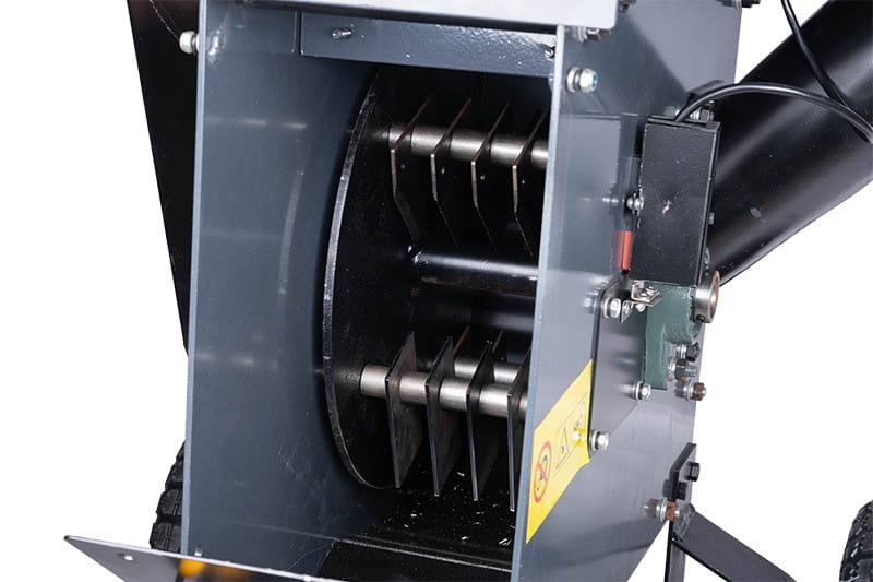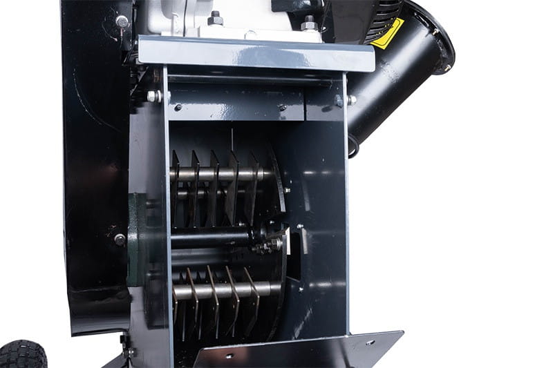 Natomiast większe i długie gałęzie należy umieszczać w bocznym otworze, który został zaprojektowany tak, aby operator był jak najbardziej chroniony przed odpryskami rozdrabnianego drewna.