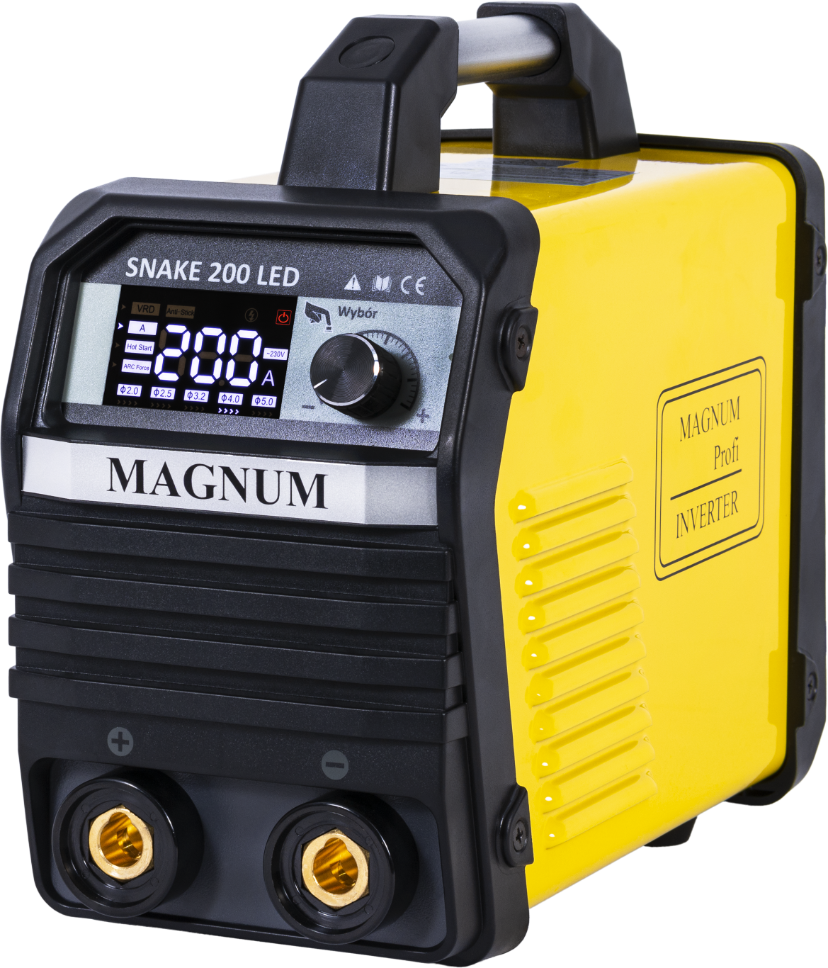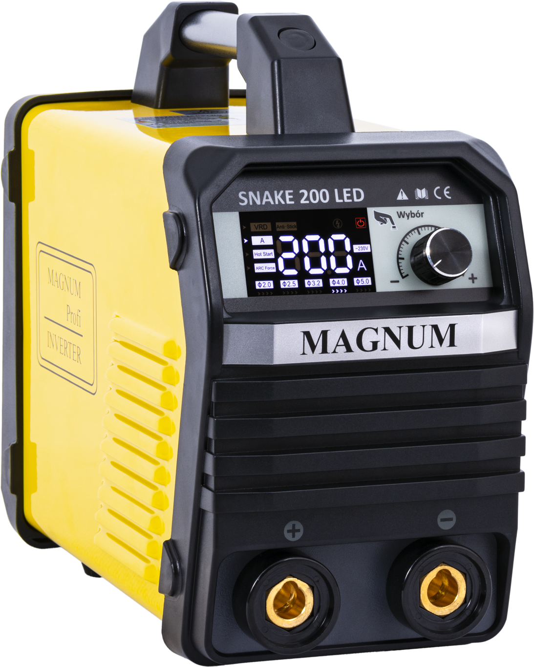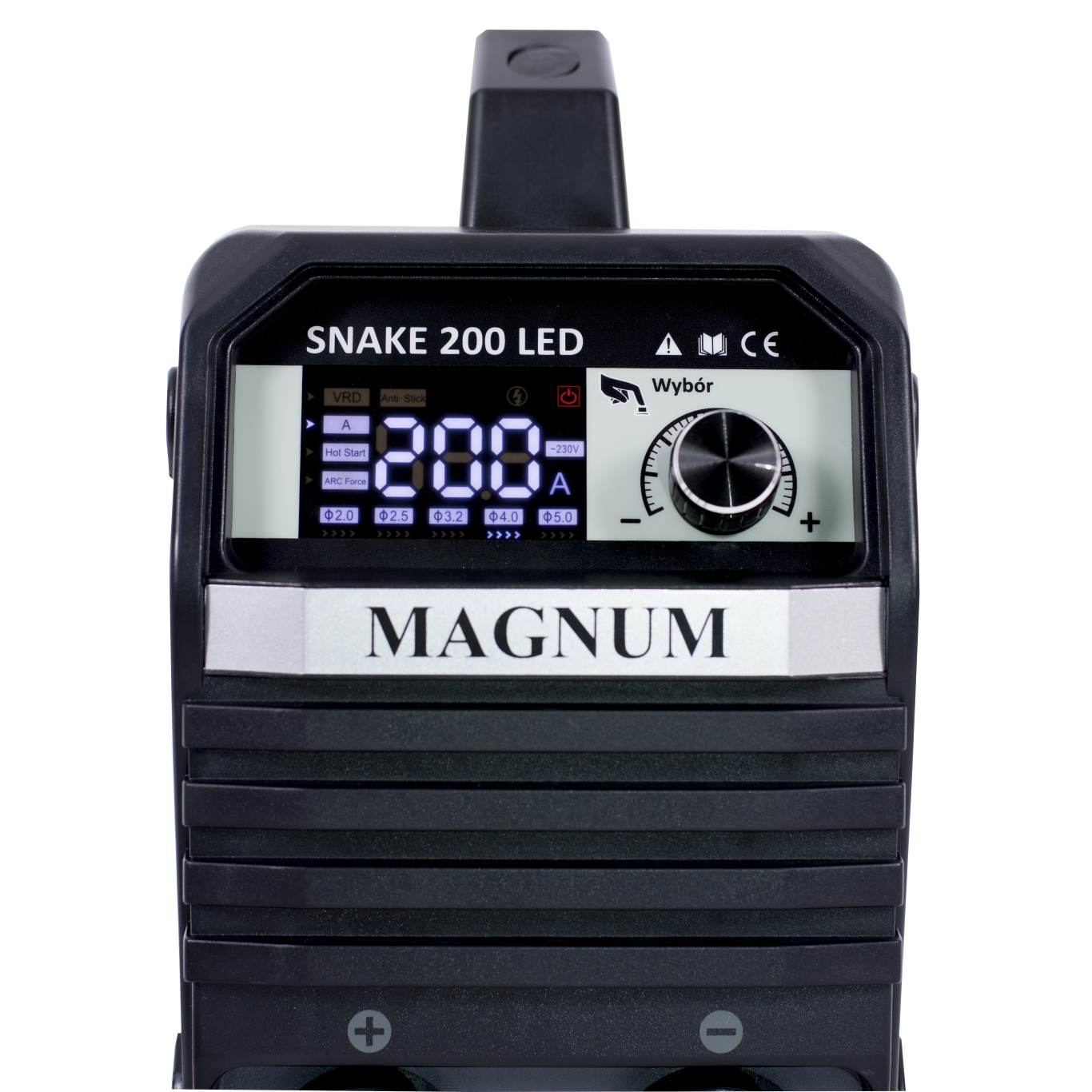 Urządzenie SNAKE 200 LED marki MAGNUM jest lekkim, przenośnym źródłem energii wykonanym w technologii inwertorowej. Urządzenie zasilane jest z sieci jednofazowej 230V, posiada maksymalny prąd spawania 200A oraz wysoką 60% sprawność. SNAKE 200 LED wyposażony jest w duży multifunkcyjny wyświetlacz LED z intuicyjny, łatwy w obsłudze panel sterowani.