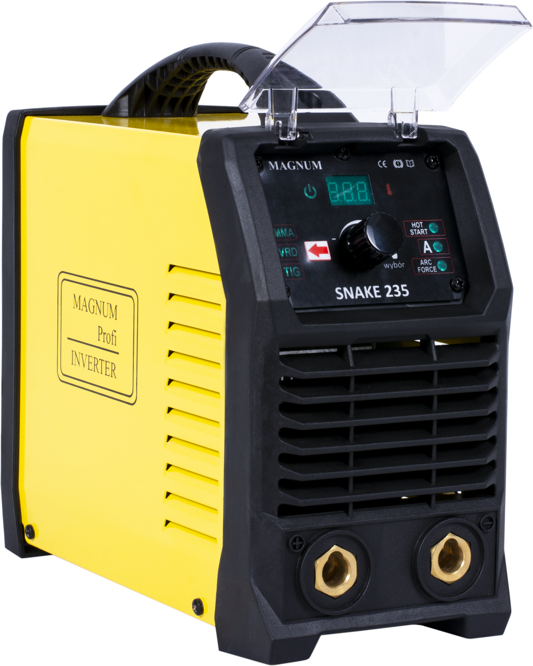 Urządzenie inwerterowe SNAKE 235 marki MAGNUM jest lekkim, przenośnym źródłem energii. Służy do spawania elektrodami otulonymi różnych gatunków stali niestopowych, niskostopowych, wysokostopowych, nierdzewnych, żaroodpornych, miedzi, żeliwa. Urządzenie charakteryzuje się dużą sprawnością 200 A/60% oraz znakomitą charakterystyką łuku dla elektrod rutylowych i zasadowych.
