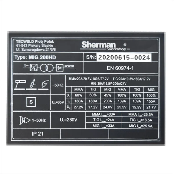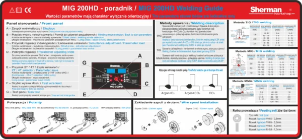 Synergiczna spawarka MIG 200HD służy do spawania ręcznego stali i metali kolorowych. Umożliwia spawanie metodami MMA (elektrodą otuloną), TIG Lift, oraz MIG/MAG w trybie synergicznym i manualnym. Dzięki zmianie polaryzacji urządzenie pozwala spawać metodą MIG/MAG z zastosowaniem zarówno standardowych drutów w osłonie gazów ochronnych jak i samoosłonowych drutów proszkowych. Urządzenie umożliwia podłączenie uchwytu typu Spool Gun z zamontowanym w nim mini podajnikiem drutu i szpulą D100 drutu stalowego lub kolorowego. Regulacja indukcyjności pozwala na lutospawanie cienkich elementów ocynkowanych. Spawarka może pracować w trybie synergicznym lub manualnym z opcją szybkiego powrotu do początkowych ustawień synergicznych. Urządzenie posiada wbudowane automatyczne funkcje HOT START i ANTI STICK, umożliwia także zapamiętanie 20 zestawów parametrów dla metody MIG.