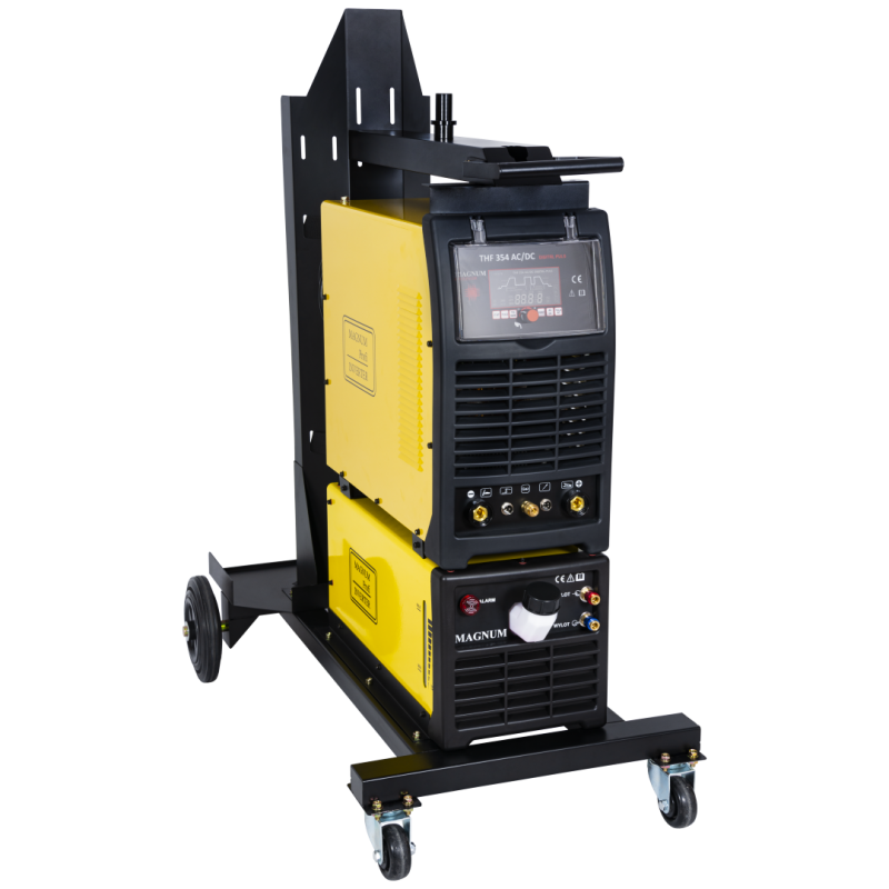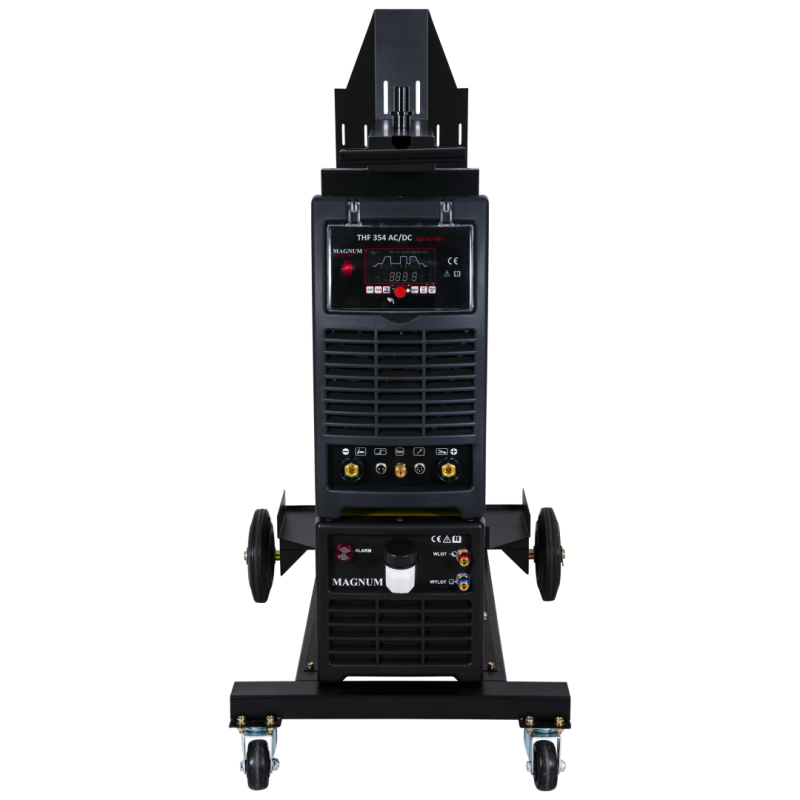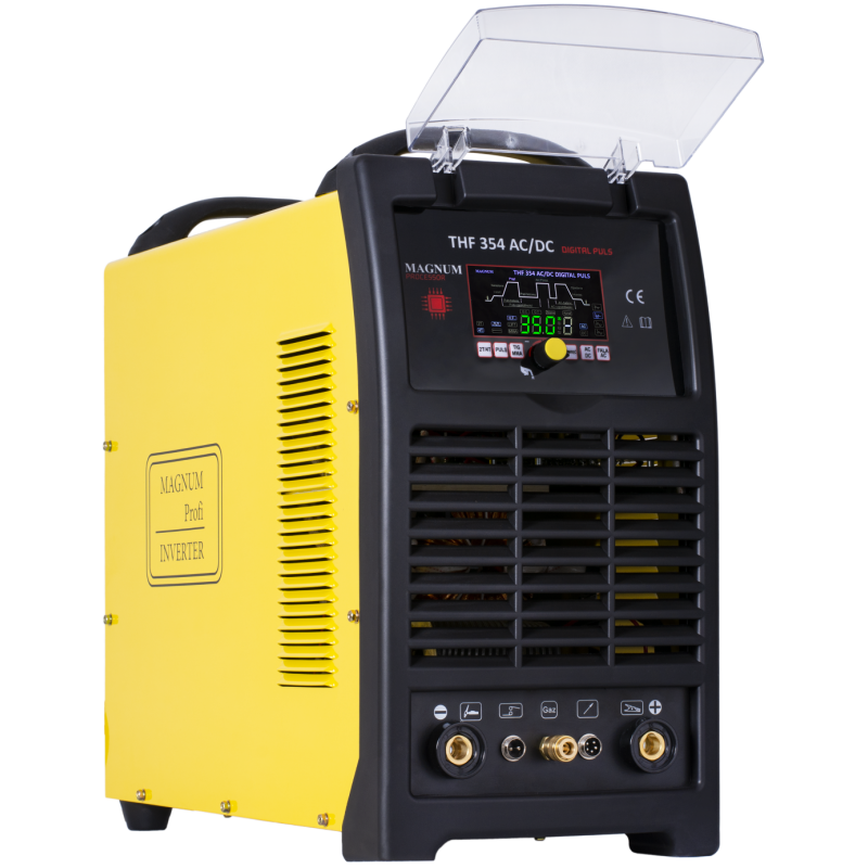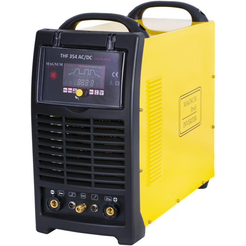 Urządzenie THF 354 AC/DC DIGITAL PULS (z chłodnicą M-COOLER 1700) marki MAGNUM jest profesjonalną spawarką inwertorową przeznaczoną do spawania metodą TIG HF (z bezstykowym zajarzaniem łuku spawalniczego) prądem przemiennym AC oraz stałym DC. THF 354 AC/DC DIGITAL PULS zapewnia doskonałą wydajność w spawaniu aluminium i jego stopów, stali niestopowej, niskostopowej, wysokostopowej, tytanu oraz innych spawalnych metali i stopów. Urządzeniem można również spawać metodą MMA z wykorzystaniem topliwych elektrod otulonych.