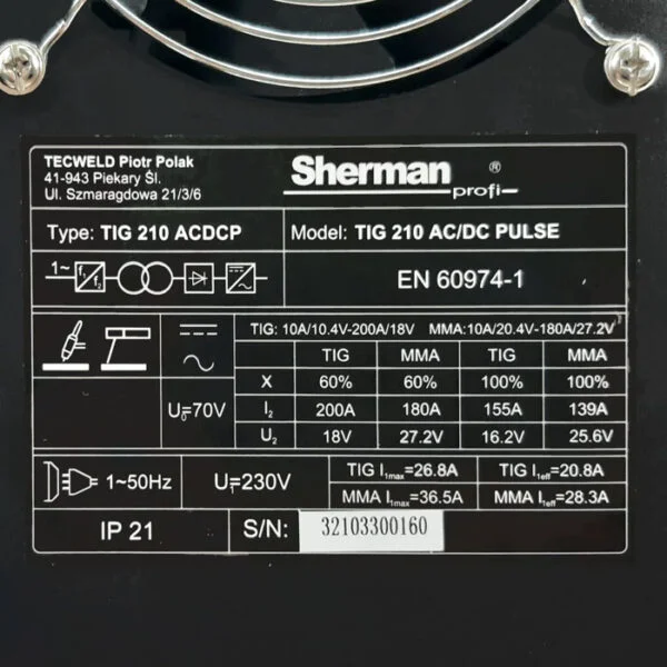 Spawarka TIG 210 AC/DC pulse HF SHERMAN