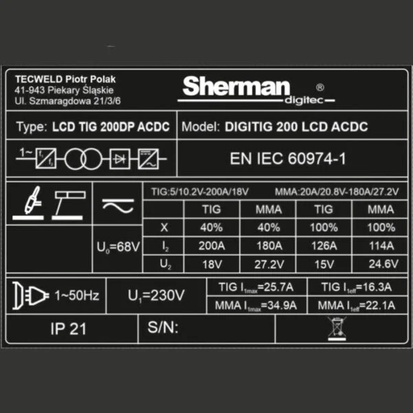 Spawarka TIG DIGITIG 200 LCD AC/DC HF SHERMAN