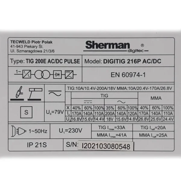 Spawarka TIG DIGITIG 216P AC/DC HF SHERMAN