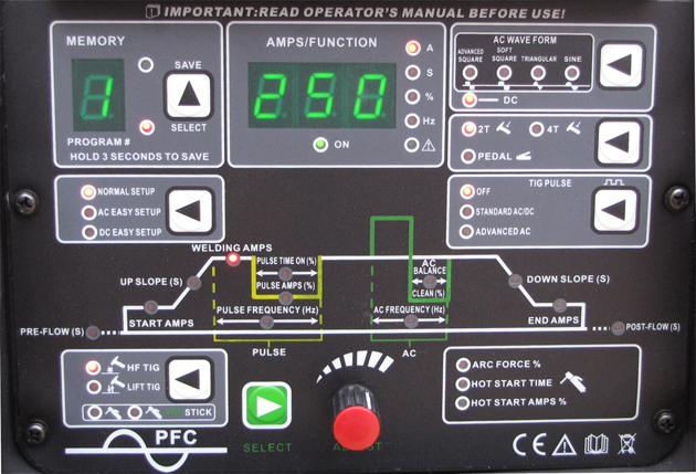 - AC EASY SETUP – w pamięci urządzenia zaprogramowane są podstawowe, wyjściowe parametry o następujących wartościach: częstotliwość 120Hz; balans 25%; czas wypływu gazu przed zajarzeniem łuku 0,5s; czas wypływu gazu po wygaśnięciu łuku 4s; prąd początkowy 50%; prąd końcowy 50%, czas narastania 1s; czas opadania 3s. Możliwość regulacji natężenia prądu spawania.