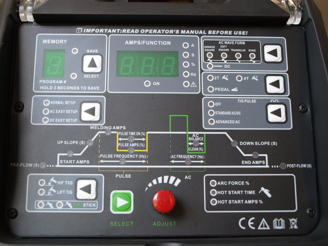 - AC EASY SETUP – w pamięci urządzenia zaprogramowane są podstawowe, wyjściowe parametry o następujących wartościach: częstotliwość 120Hz; balans 25%; czas wypływu gazu przed zajarzeniem łuku 0,5s; czas wypływu gazu po wygaśnięciu łuku 4s; prąd początkowy 50%; prąd końcowy 50%, czas narastania 1s; czas opadania 3s. Możliwość regulacji natężenia prądu spawania.