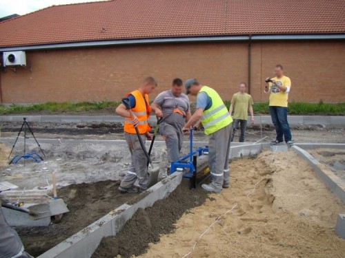 W momencie zablokowania blachy (obie dźwignie muszą być wówczas w pozycji pionowej), zasyp powstałą przestrzeń, między blachą a krawężnikiem, betonem, a następnie go ubij. Następnie należy odblokować dźwignie i przesunąć szalunek o około 120 cm. i powtórzyć te same czynności.