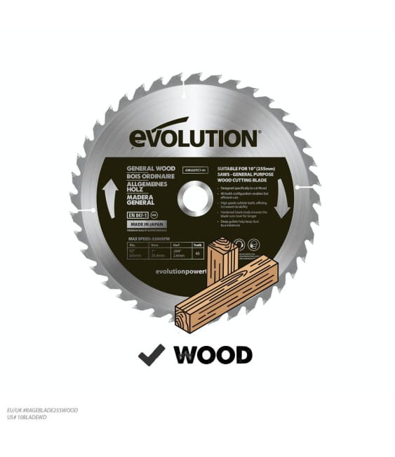 Wysokiej jakości piła tarczowa z uzębieniem z węglika spiekanego firmy Evolution Power Tools. Przeznaczona do cięcia drewna.