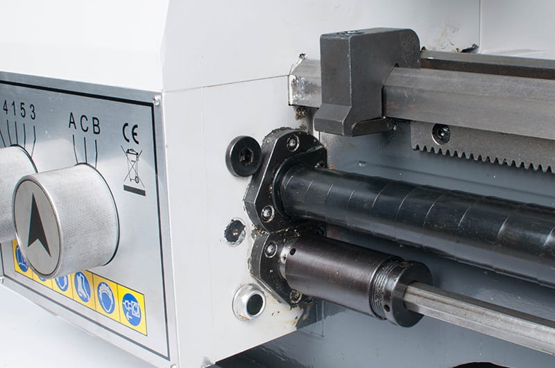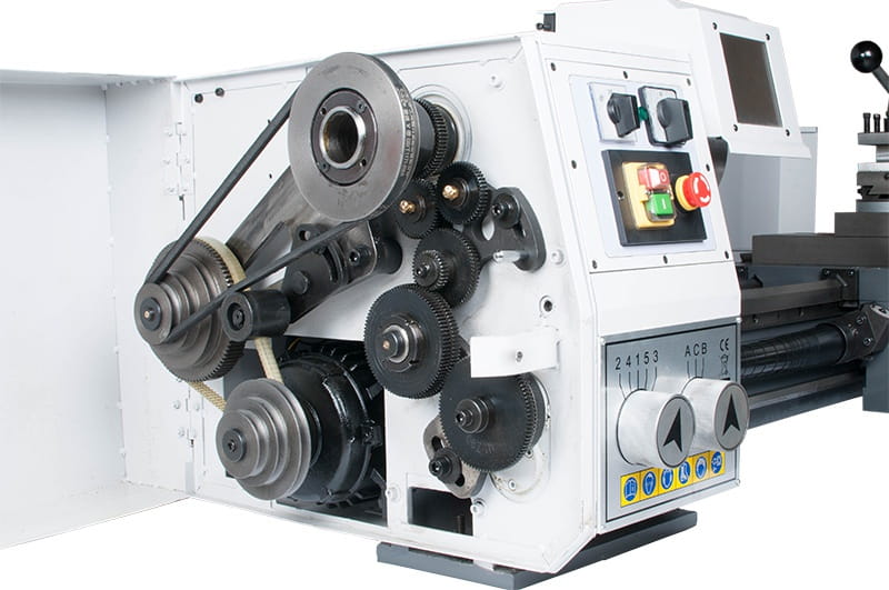 Duża skrzynia przekładniowa dzięki czemu tokarka nadaje się do codziennej pracy w warunkach przemysłowych.