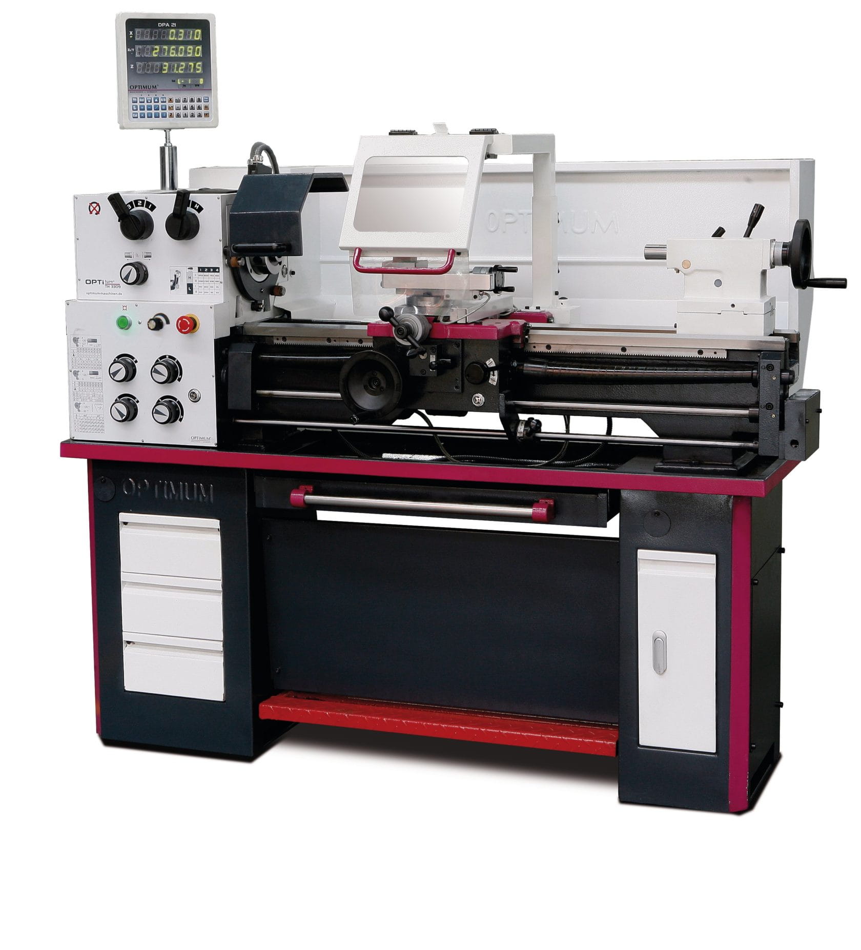 Kompletnie wyposażona tokarka ze śrubą pociągową, wałkiem pociągowym, cyfrowym wskaźnikiem położenia DPA 21 oraz bezstopniową regulacją prędkości obrotowej wrzeciona TH 3309V OPTIMUM