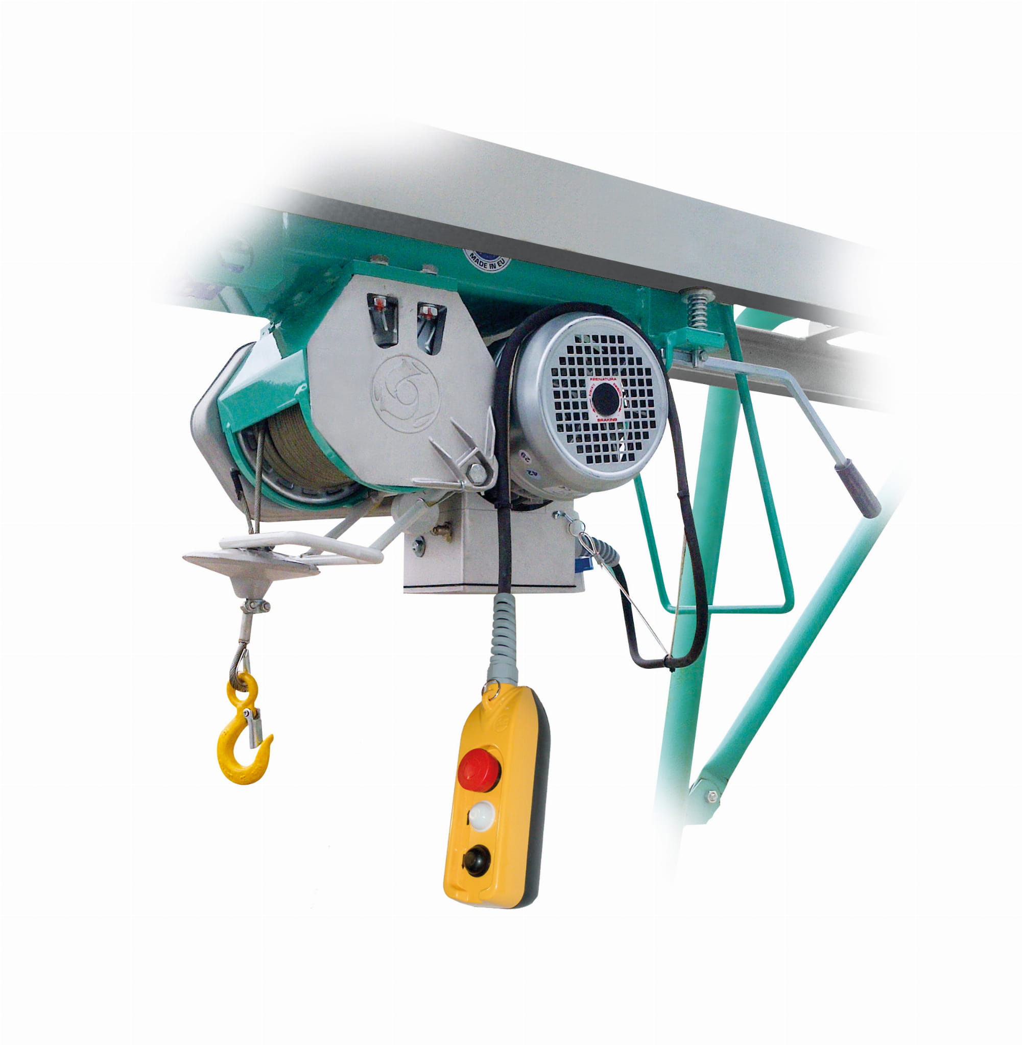 Wciągarka przystosowana jest do pracy z napięciem 210 – 235 V. Bęben na linę umieszczony poprzecznie względem nie zawsze wypoziomowanej pionowo ramy, zapobiega nawijaniu się liny na jednym boku.