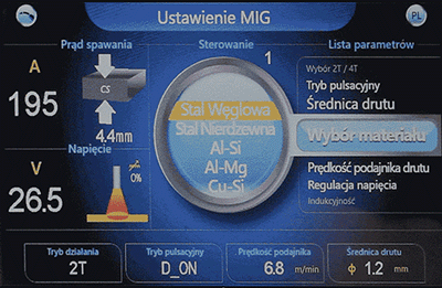 Intuicyjny, łatwy w obsłudze panel sterowania z kolorowym wyświetlaczem pozwala na szybkie ustawienie wszystkich najważniejszych parametrów spawania. Użytkownik może wybrać jeden z pięciu języków menu: polski, angielski, niemiecki, rosyjski lub czeski. Dzięki ustawieniom synergicznym możliwe jest automatyczne dobieranie parametrów spawania do średnicy drutu spawalniczego oraz grubości i rodzaju materiału.