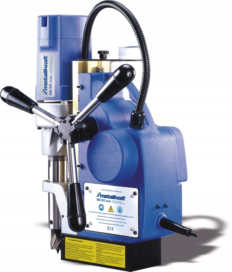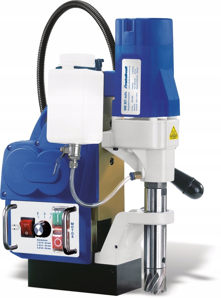 Wiertarka rdzeniowo magnetyczna MB 301 Auto to sprzęt, wykorzystujący wiertła rdzeniowe, przez które dostarczany jest płyn chłodzący, z uchwytem Weldona 19mm. Wyposażony jest w automatyczny posuw tulei dzięki czemu praca jest wygodniejsza i lżejsza. Ponad to specjalnie nisko zamontowana, długa prowadnica tulei gwarantuje bezpieczne i stabilne prowadzenie wierteł.