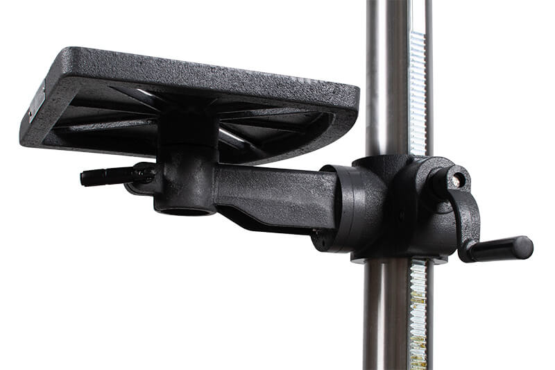 Stół roboczy może być obracany o 360° za pomocą sworznia obrotowego i pochylany w zakresie +/-45°, co umożliwia wiercenie otworów pod różnymi kątami