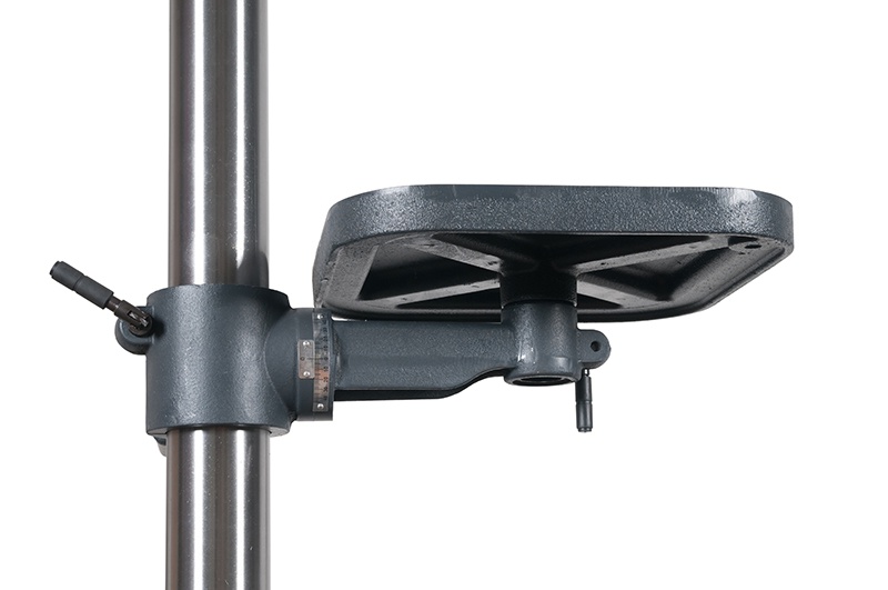 Stół roboczy może być obracany o 360° za pomocą sworznia obrotowego i pochylany w zakresie +/-45°, co umożliwia wiercenie otworów pod różnymi kątami